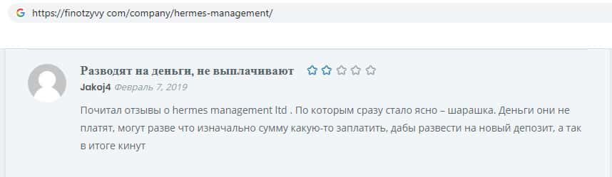 Данный отзыв несёт в себе полезную информацию о жуликах Гермес Менеджмент. В нём рассказывается о том, что по компании сразу видно, что это шарашка, и деньги платить они не будут, могут лишь кинуть какую нибудь копейку для заманухи, что бы развести пользователя на более щедрый депозит, а потом отобрать все деньги.