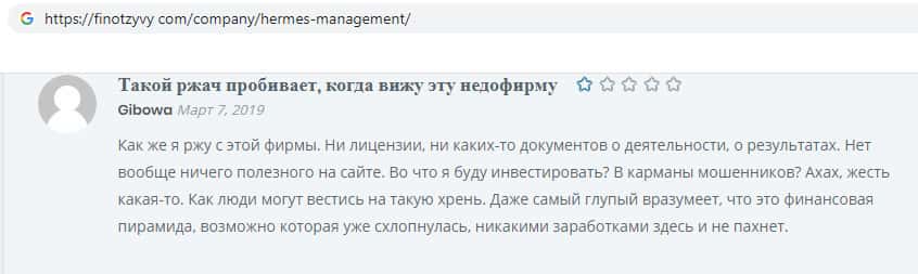 Данный пользователь высказал в комментарии всё своё недовольство мошенниками Гермес Менеджмент. Он возмущён ужасным сайтом компании, деятельностью и многим другим. Из этого отзыва мы понимаем. что это за контора и что из себя представляет. Пользователь буквально недоволен всем, и это не удивительно, так как это мошенники.