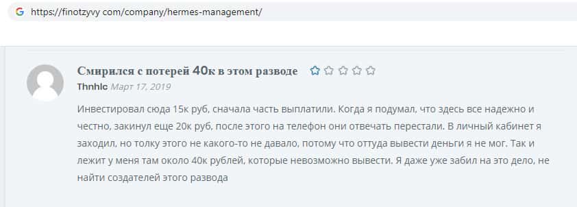 В своём отзыве пользователь поведал нам о том, как фальшивая контора Гермес Менеджмент кинула его на 40000 рублей. С начало он закинул деньги, и даже смог часть вывести, потом закинул больше, но потом на телефонные звонки компания не отвечала, а деньги из личного кабинета он вывести не может, и уже смирился с потерей денег.