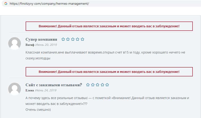 А вот и очередной заказ от жуликов Hermes-Ltd Com подъехал. Даже сам сайт с отзывами указывает, что это заказные отзывы, и они могут вводить в заблуждение пользователей. А это компании и нужно, запудрить мозги наивным пользователям, а затем заманивать их, внушая ложную информацию о конторе мошенников.