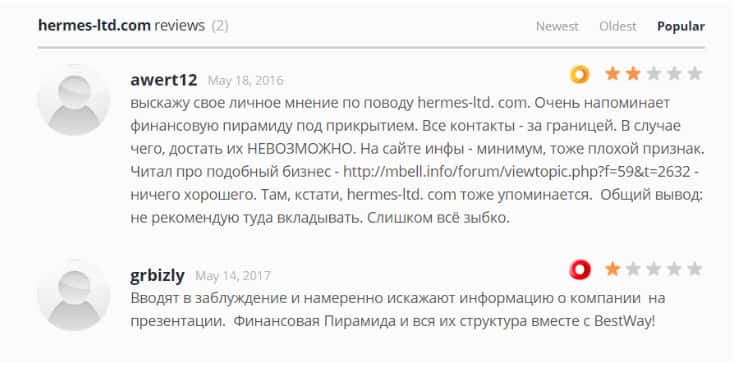 - Сайты с отзывами опровергают заказухи от мошенников Hermes-Ltd Com