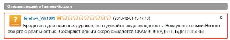 Данный отзыв оказался самым информативным среди всех. Пользователь в отзыве раскрыл мошенников Hermes-Ltd Com, рассказал о том как они жульничают и суть их мошеннической деятельности. Пользователь упомянул, что вкладывать деньги в такую фирму могут только слепые, глупые или любители финансовых пирамид.