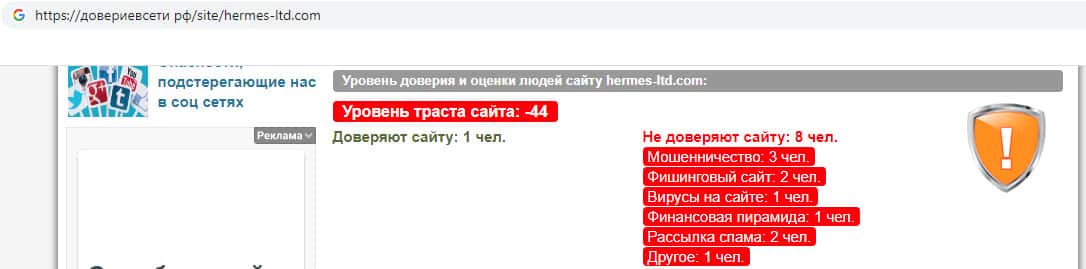 - Уровень доверия сайта кидал Hermes-Ltd Com