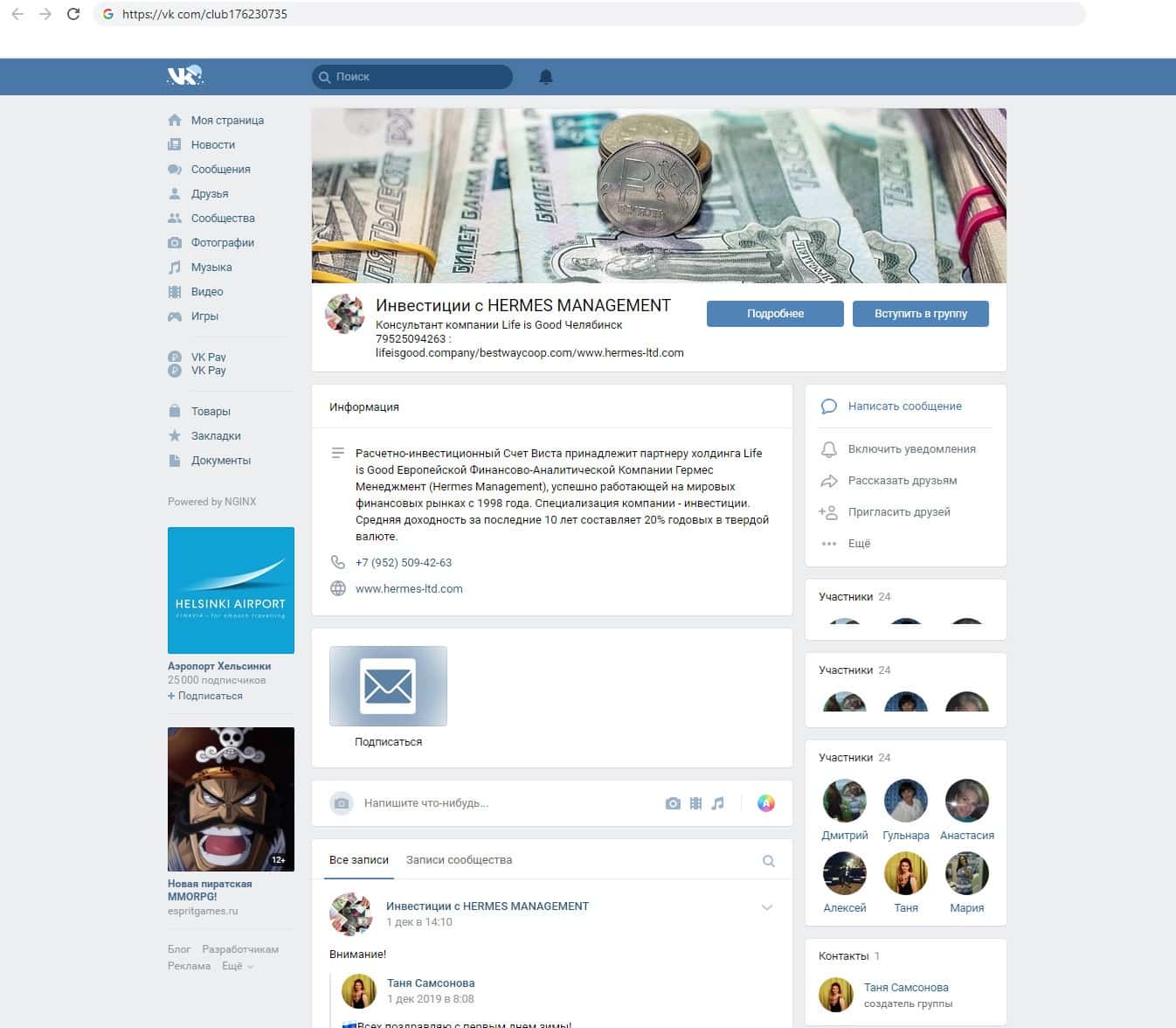 В социальной сети Вконтакте присутствует страница мошенников Hermes-Ltd Com. Там набралось очень мало интересующихся, так как о деятельности компании все уже знают, и никто не хочет сотрудничать с мошенниками. 24 человека, именно столько людей заинтересовались мошенниками. И скорее всего это создатели страницы.