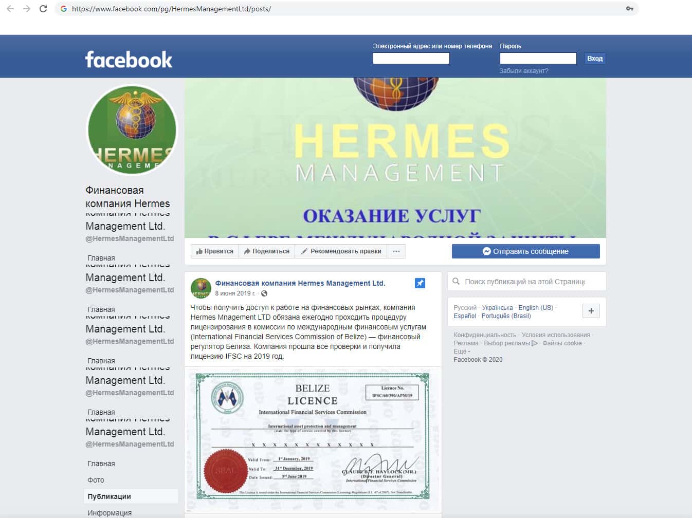 На главном интернет ресурсе мошенников Гермес Менеджмент нет информации о том, компания сотрудничает с социальными сетями. Но учитывая то, что это Австрийская компания, то её страницы в социальных сетях должны быть на зарубежном языке. А у компании есть страницы на российских соц сетях, и все на русском языке.