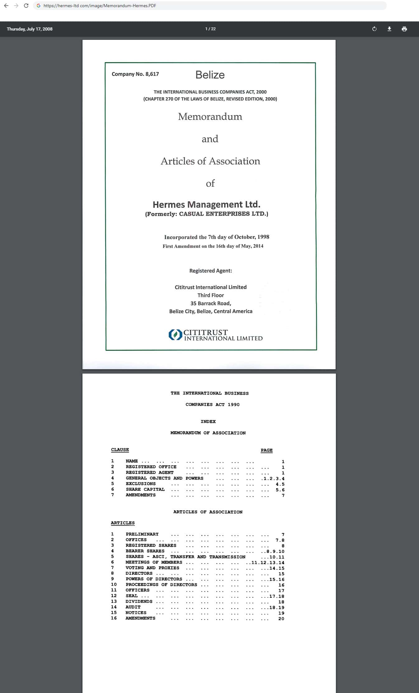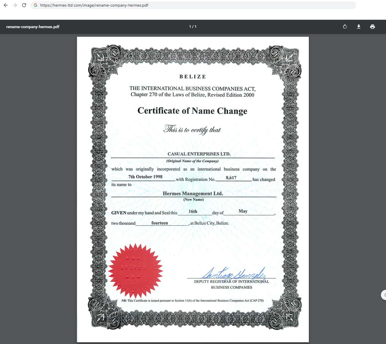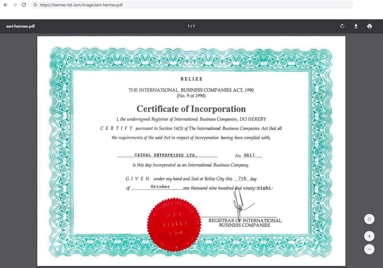 Аферисты Hermes-Ltd Com везде тычут свои сертификаты, которые нарисовали в фотошопе, но если капнуть глубже, оказывается что лицензии у компании нет, и жуликам вообще запрещено вести какую любо деятельность связанную с торговлей на бирже с 2016 года, а они всё равно продолжают разводить людей на деньги.Фальшивый сертификат инкорпорации, предоставленный мошенниками Hermes-Ltd Com.