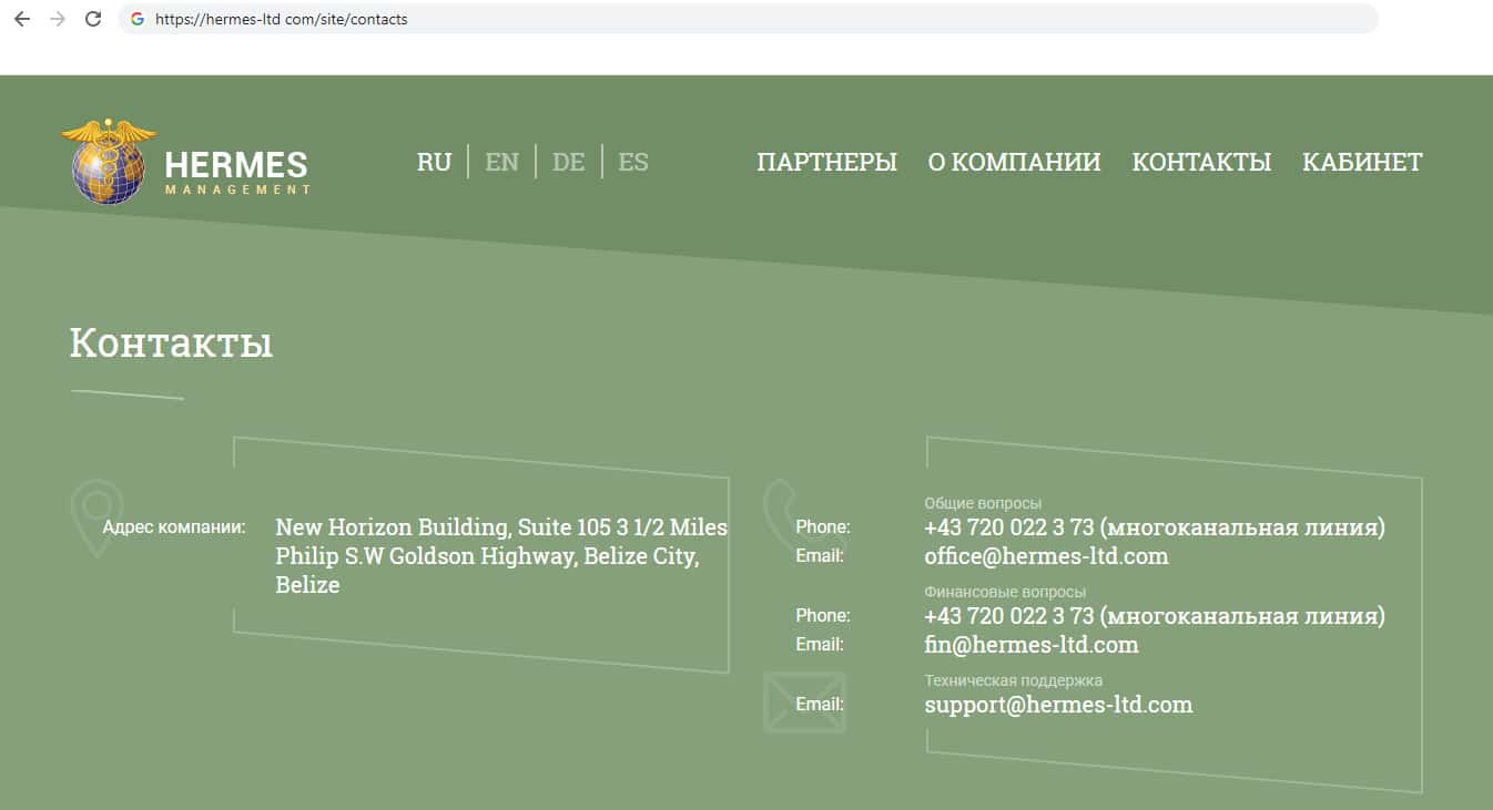 Воры Гермес Менеджмент указали свои контактные данные. Но исходя из отзывов мы видим, как мошенники просто блокируют номера или не отвечают на почту. По этому контактные данные были указанны исключительно ради того, что бы хоть чем то заполнить информацию на сайте. Контактные данные мошенников: