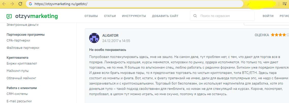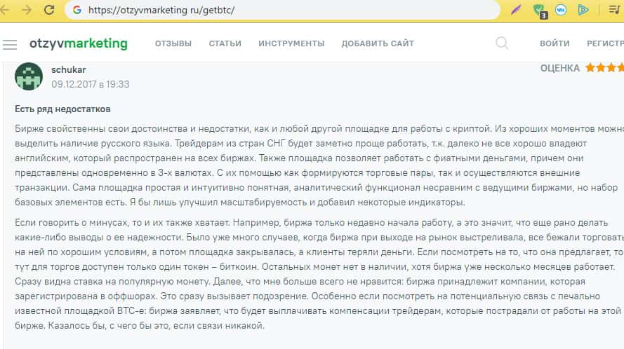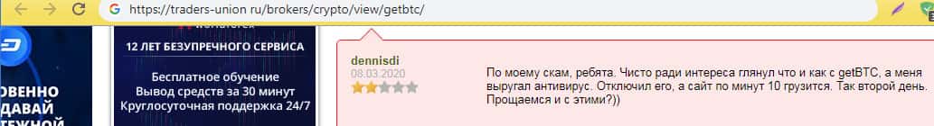 Недовольный клиент оставил отзыв о мошенниках GetBTC
