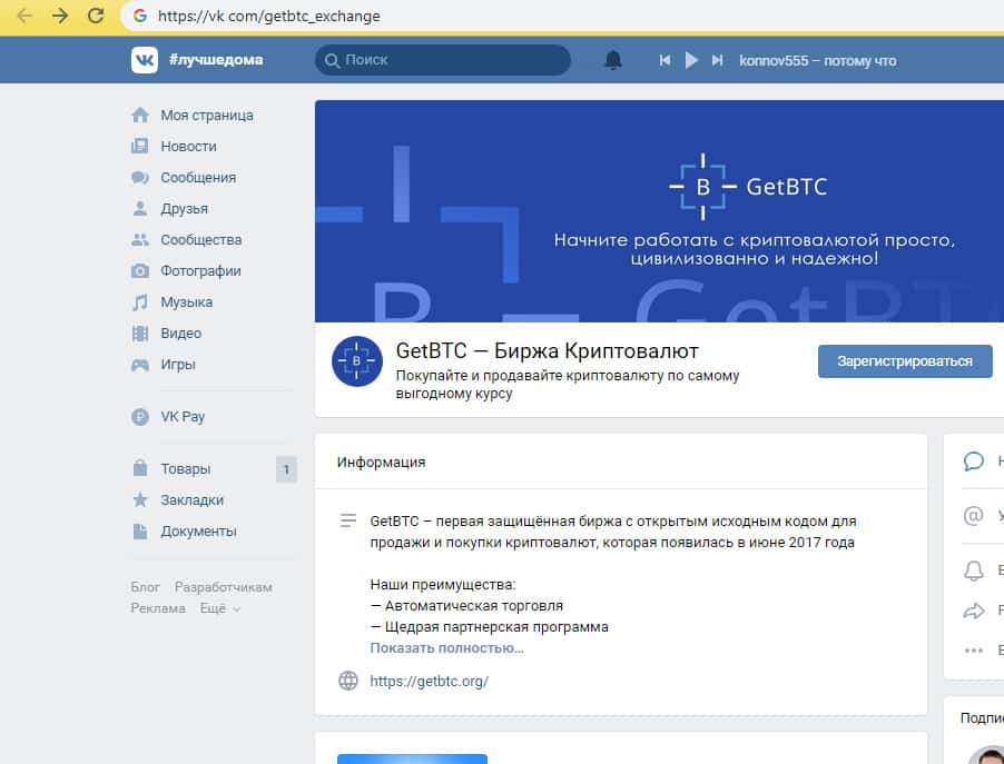 Кроме того, у аферистов Гет БТС есть и страница в социальной сети Вконтакте, где у шулеров GetBTC размещена довольно стандартная и типичная лапша на уши и накручено чуть более одной тысячи подписчиков. На изображении, расположенном ниже, вы можете наглядно увидеть страницу аферистов GetBTC в социальной сети ВК.
