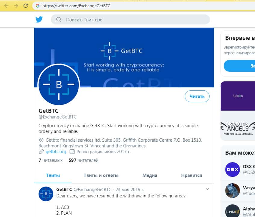 Для размещения различных заманчивых постов с лапшой на уши наивной клиентуре аферисты GetBTC обзавелись страницей в социальной сети Твиттер, где у мошенников Гет БТС имеется около 600 подписчиков. На изображении, расположенном ниже, вы можете увидеть страницу аферистов GetBTC на площадке Твиттер.