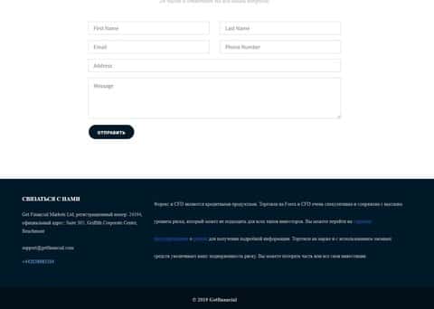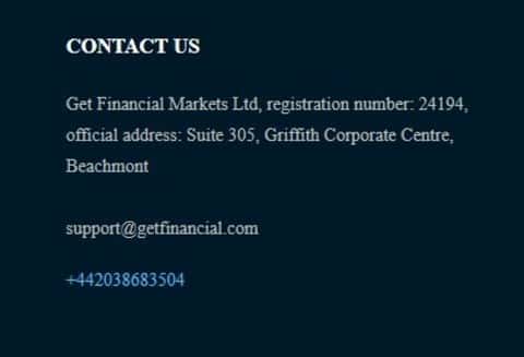 Реальных и достоверных контактов для связи с шулерами Get Financial они не предоставили. Расположенные на сайте жуликов Гет Финанс контакты для связи с ними являются чисто формальностью и никто из самих мошенников Get Financial за ними особо не следит, так что никакого нормального общения с лохотроном Гет Финанс у вас не выйдет. Контакты, предоставленные аферистами Get Financial перечислим ниже: