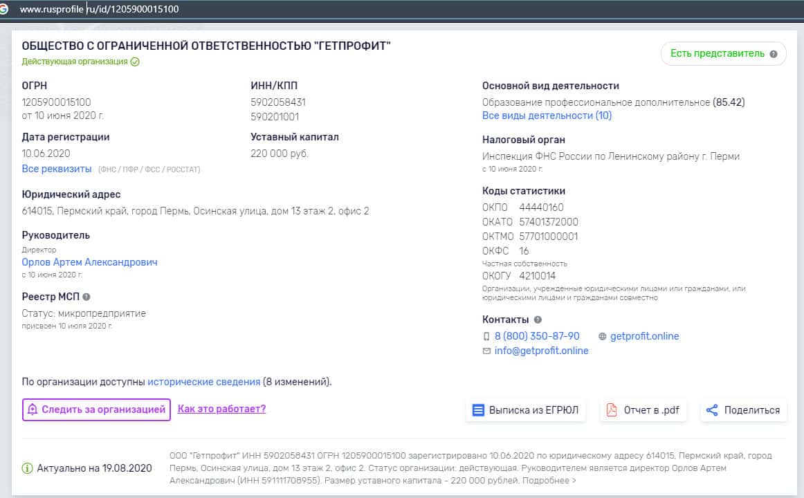 Далее представлена информация о юридическом лице псевдо-школы форекс Гет Профит и этой компанией выступает некая ООО "ГЕТПРОФИТ", зарегистрированная в России.