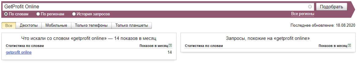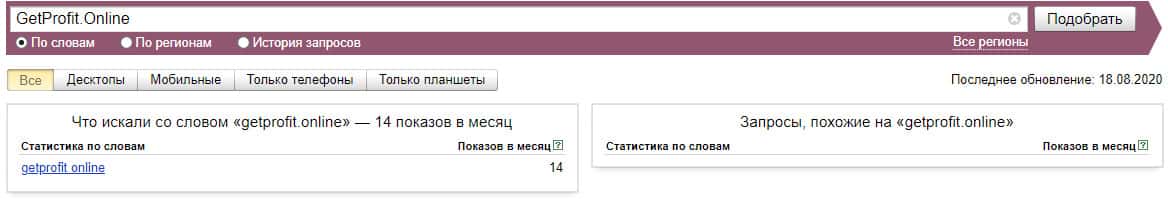 Если ввести бренд в виде официального сайта конторы без точки "GetProfit Online", то поисковая система Яндекс выдает 14 показов за месяц.