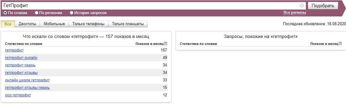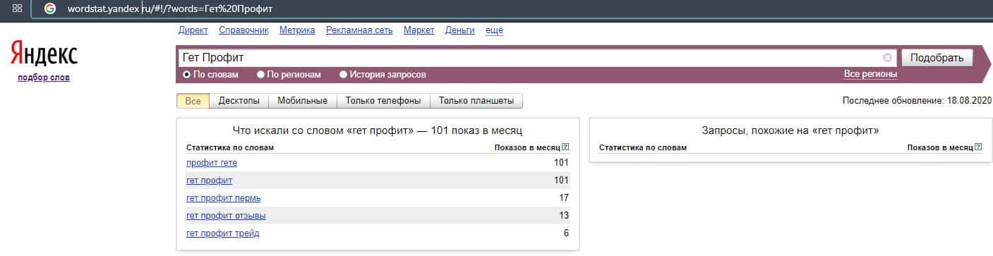 Следующим вариантом, мы решили пробить информацию бренда "ГетПрофит " и, согласно Яндекс Вордстат, запросов было почти в полтора раза больше, чем предыдущего бренда.
