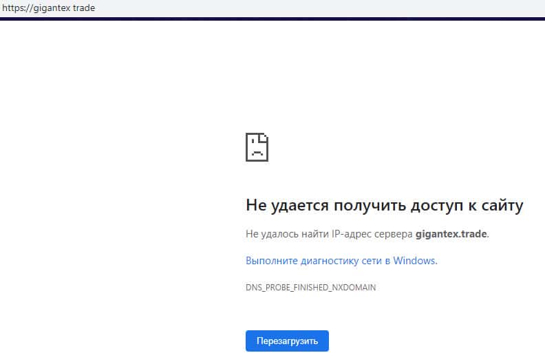В связи с крайне не успешной мошеннической и противозаконной деятельностью шулеров Gigantex Trade на просторах сети интернет аферисты Гигантекс Трейд приняли вполне логичное решение, а именно жулики Gigantex Trade попросту удалили свой подвальный сайт. На изображении, расположенном ниже, вы можете наглядно увидеть результат перехода на сайт шулеров Гигантекс Трейд.