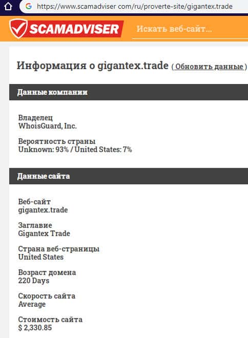 Техническую же информацию о подвальном сайте проходимцев Гигантекс Трейд можно узнать непосредственно с помощью веб-площадки scamadviser com, которая расскажет о довольно кратком сроке существования сайта аферистов Gigantex Trade. На изображении, расположенном ниже, вы можете наглядно увидеть техническую информацию о сайте шулеров.