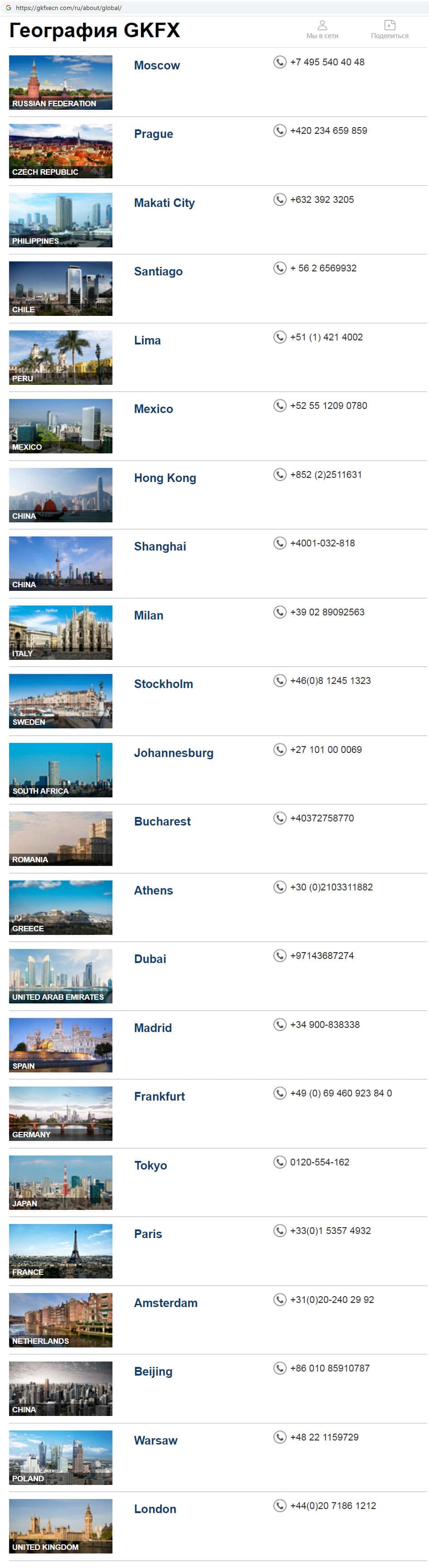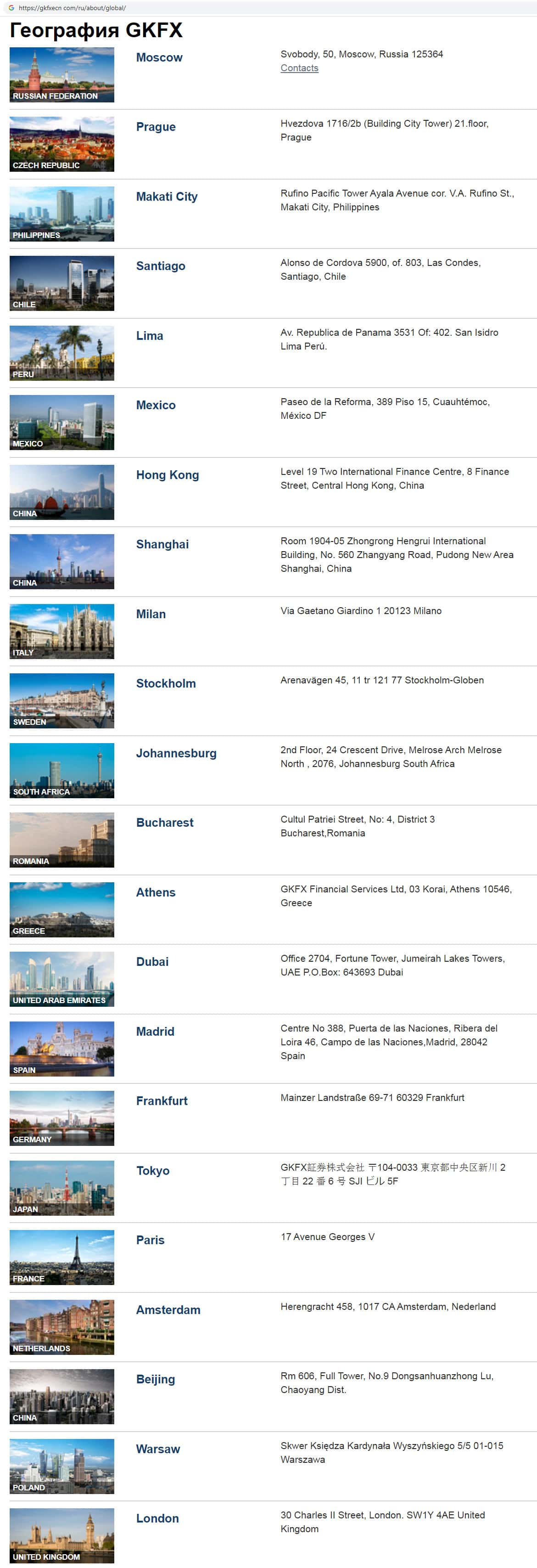 Мошенники GKFX ECN указали множество адресов местонахождения главного офиса своей компании, которые скорее всего липовые: