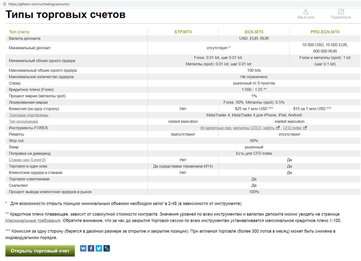 Жулики GKFX ECN предлагают 3 типа торгового счета: STP MT4, ECN MT4, а так же PRO ECN MT4. Реальный форекс стартует в основном с суммы в 100000 долларов.