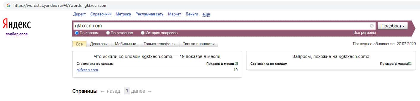 Количество запросов по бренду названия домена без точки "gkfxecn com" на wordstat yandex ru составило также 19 запросов за месяц.