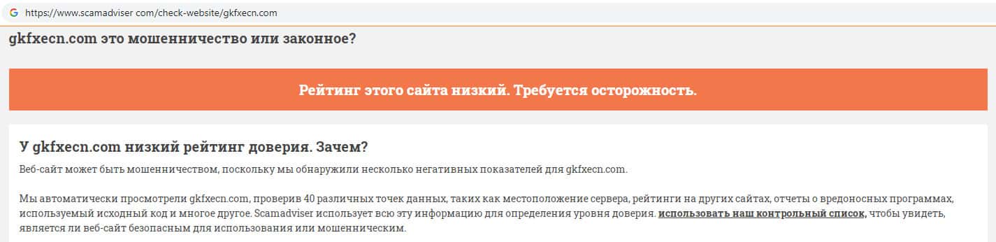 Согласно информации, которая расположена на сайте scamadviser com о мошеннической организации GKFX ECN, у сайта компании низкий рейтинг, регистрироваться здесь не стоит.