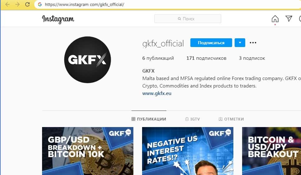 Для размещения различных заманчивых постов с лапшой на уши наивной клиентуре аферисты GKFX обзавелись страницей в социальной сети Инстаграм, где у мошенников ГКФХ имеется около 6 тыс. подписчиков. На изображении, расположенном ниже, вы можете увидеть страницу аферистов ГКФХ на площадке Инстаграм.