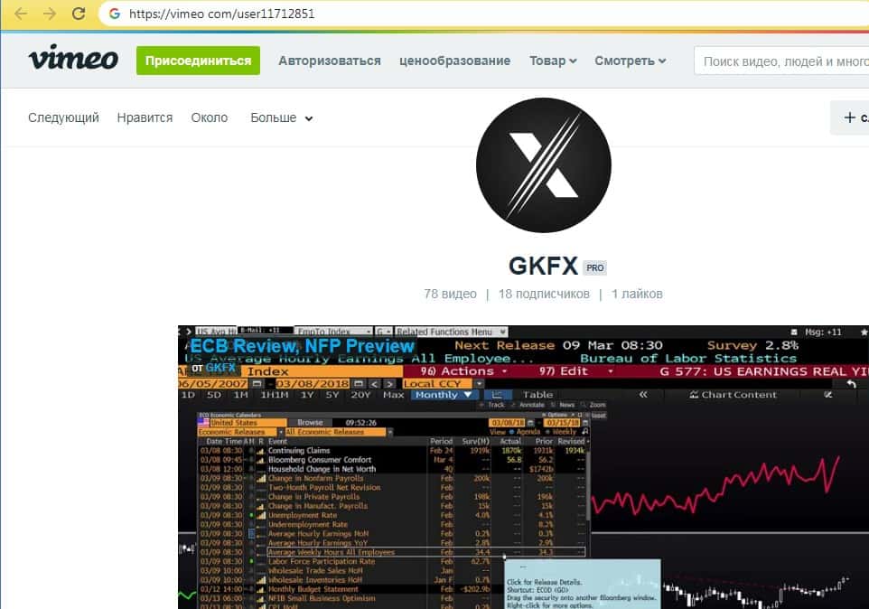 Дабы соответствовать современным трендам шулера ГКФХ создали себе страницы в социальных сетях, одной из которых является Вимео, где у мошенников GKFX имеется всего восемнадцать подписчиков. На изображении, расположенном ниже, вы можете увидеть внешний вид страницы проходимцев в этой социальной сети.