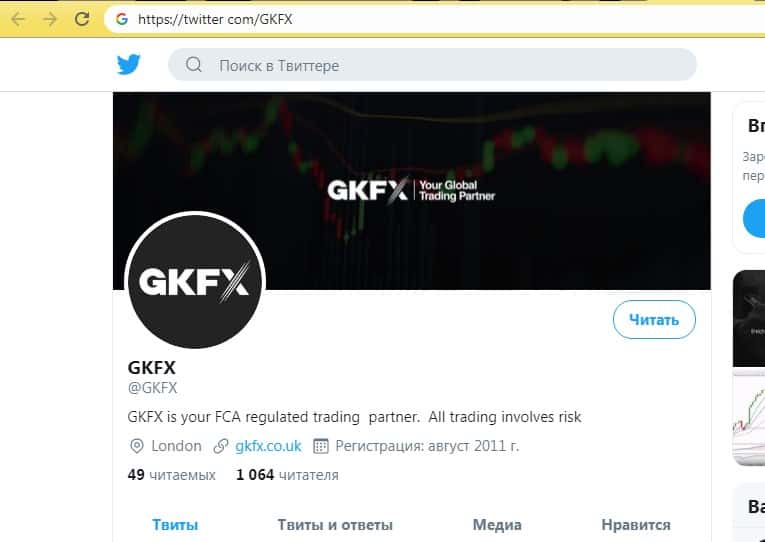 Кроме того, аферистов ГКФХ есть и страница в социальной сети Твиттер, где у шулеров GKFX размещена довольно стандартная и типичная лапша на уши и накручено несколько тысяч подписчиков. На изображении, расположенном ниже, вы можете наглядно увидеть страницу аферистов GKFX в социальной сети Twitter.