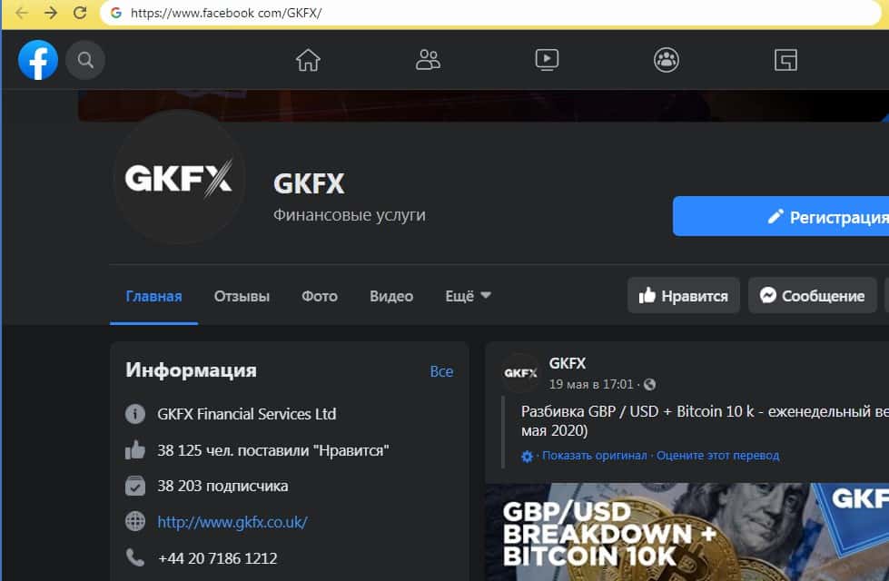 Для того чтобы выкладывать различные интересные и не очень посты с лапшой на уши наивной клиентуре аферисты ГКФХ обзавелись страницей в социальной сети Facebook, где у мошенников почти ничего нет. На изображении, расположенном ниже, вы можете увидеть страницу аферистов ГКФХ на площадке фейсбук ком.