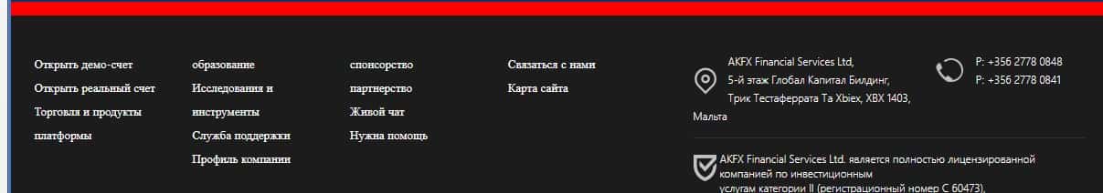 - адрес - AKFX Financial Services Ltd. Level 4, The Penthouse, Ewropa Centre, Triq Dun Karm, Birkirkara BKR 9034, Malta;