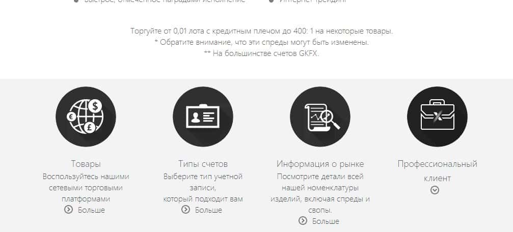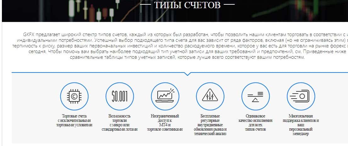 В разделе для клиента подвальных мошенников GKFX написано много красивых слов, которые заставляют верить доверчивых клиентов в то, что кухня хорошо поработала над качеством графики, звучанием, а еще у них можно выбирать даже вид аккаунта и типы счетов, на которых потом торговать.