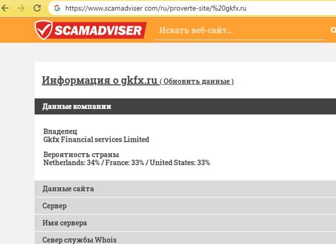 Дополнительную информацию мы попробовали найти на известном сайте-тестировщике, но как видно на изображении, расположенном ниже, толком никаких данных найдено не было. Подозрительно выглядит шарага GKFX, которая соскамилась так быстро и переехала на другой домен, не оставив о себе данных даже о домене, с которого они кидали людей.