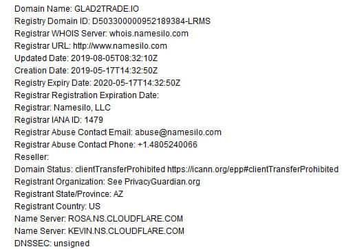 Домен мошеннической конторки Глад 2 Трейд был зарегистрирован только в мае 2019 года! Видимо ее организаторы только недавно перебежали с другого лохотрона. Скорее всего, следующий их лохотрон будет мало чем отличаться от других.