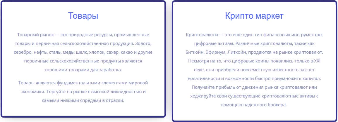 Отдельно внимания заслуживает обзор инструментов, которыми они приманивают лохов. Чего тут только нет: рынок акций, валютный рынок, товарный и криптовалюта. Прям мастера на все руки. На деле же они занимаются одним единственным - обирают людей.