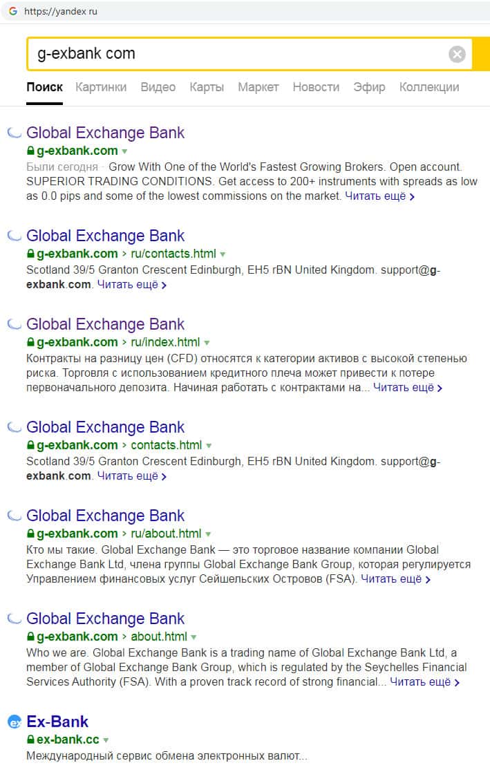 - Контактная информация жульнической организации Глобал Эксчэндж Банк