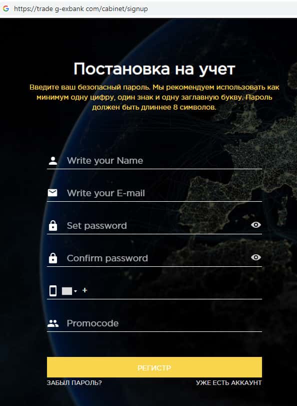 Для того, чтобы зарегистрироваться на сайте аферистов Глобал Эксчэндж Банк необходимо назвать имя, адрес электронной почты и пароль, и конечно же подтвердить то, что Вы соглашаетесь с условиями пользования сайтом. Прежде чем поставить галочку в данной форме, подумайте стоит ли так рисковать своими деньгами?