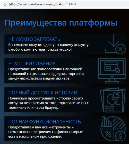 О каких-либо преимуществах торговой платформы на сайте аферистов GlobalExchangeBank не может быть и речи, потому что на нее взлянуть можно только лишь зарегистрированным пользователям. Поэтому велика вероятность того, что платформа будет зависать в самый неподходящий момент !!!