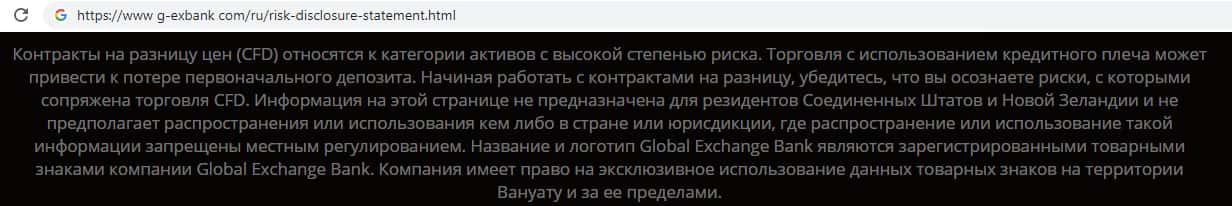 - Информация о всевозможных рисках на сайте скам-брокера GlobalExchangeBank