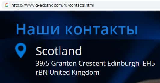 На официальном сайте скам-брокера указано, что главный офис конторы GlobalExchangeBank находится в северной стране Соединенного Королевства Великобритании, а именно в Шотландии.