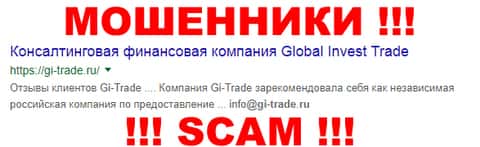 Глобал Инвест Трейд - очередные мошенники сети интернет, которые в течении года занимаются наглым разводом наивных пользователей сети под предлогом консалтинговых и инвестиционных услуг, в ходе которых шулера Глобал Инвест Трейд сливают своих клиентов. В связи с этим иметь дело с лохотроном Global Invest Trade определенно не рекомендуем !!!