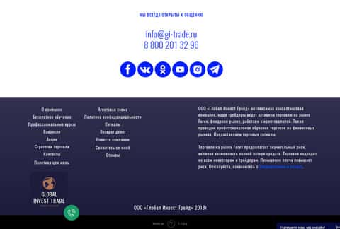 Хоть под контакты мошенники Глобал Инвест Трейд отвели отдельный раздел, хотя самих контактов у лохотрона Global Invest Trade маловато. Но они им и не нужны, ведь если шулера Глобал Инвест Трейд вышли на клиента, то и тянуть деньги жулики Global Invest Trade будут с него лично, или же по телефону. Контакты шулеров Глобал Инвест Трейд перечислим ниже: