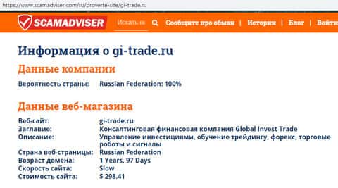 В связи с мошеннической и противозаконной деятельностью реальные руководители аферистов Глобал Инвест Трейд предпочитают анонимность дабы избежать ответственности со стороны правоохранительных органов. Информацию о самом сайте лохотрона Global Invest Trade можно узнать с помощью портала scamadviser com, которую вы можете увидеть ниже.