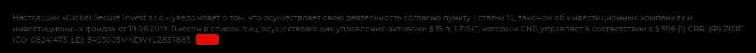 Юридическим лицом, которое отвечает за деятельность махинаторов Глобал Секьюре Инвест, является Global Secure Invest s.r.o.. Но неясен род деятельности и статус конторы.