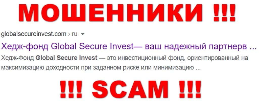 Глобал Секьюре Инвест - очередной надувной хедж-фонд, который занимается только постоянным кидаловом и обворовыванием несчастных клиентов, в результате чего они лишаются честно заработанных денежных средств. Иллюзорная финансовая структура GlobalSecureInvest прославилась такими аферами, как противозаконные манипуляции с отзывами на сайтах и форумах, мошенничество с ПАММ-счетами, невывод денежных средств - это лишь малый список их так называемых "достижений". Поэтому, лучше всячески обходить десятой дорогой и не вкладывать собственные деньги в работу с проходимцами из фиктивной инвестиционной организации Глобал Секьюре Инвест!!!