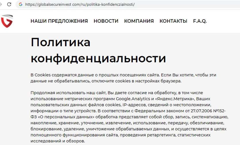 Злодеи GlobalSecureInvest разместили только вот такой документ - политику конфиденциальности, в котором расписаны обязательства клиента при посещении ресурса.