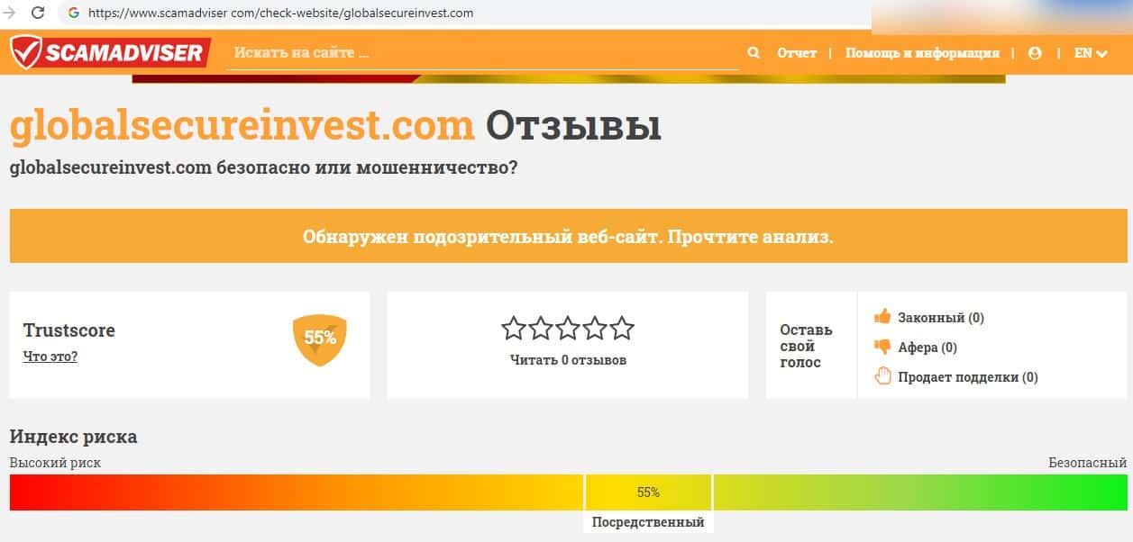 Фиктивный центр GlobalSecureInvest по мнению уважаемого портала scamadviser com имеет посредственный рейтинг 55 %, также данный интернет-сайт может быть очень подозрительным.