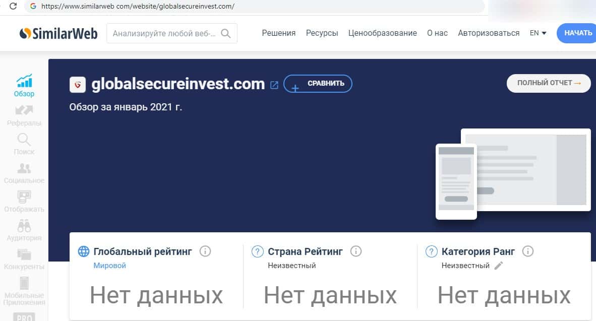 Сведения об интернет-площадке мошенников Глобал Секьюре Инвест на веб-сайте similarweb com