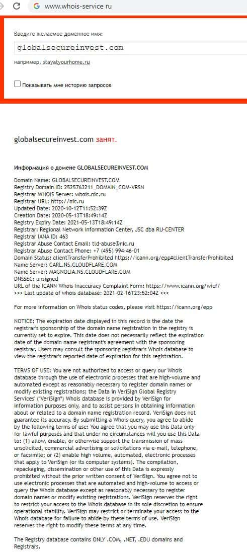 Кому принадлежит домен никчемной инвестиционной компании GlobalSecureInvest?