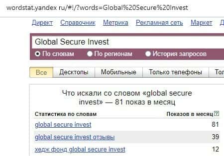 Англоязычный вариант брендового названия "Global Secure Invest", вбиваемого на английском языке на сервисе Яндекс.Вордстат, набрал 81 значение по запросам за месяц.