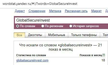 21 показ за месяц в поисковом сервисе Яндекс осуществляли интернет-пользователи по поиску доменного имени на английском языке без пробелов "GlobalSecureInvest".