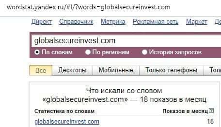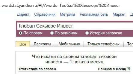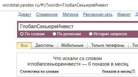 Русскоязычный вариант доменного имени "ГлобалСекьюреИнвест", вбиваемого без единого пробела в поисковике Яндекс.Вордстат, набрал нулевое значение по запросам за месяц.